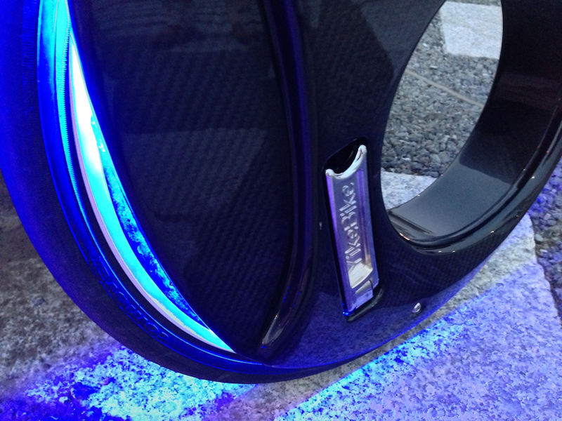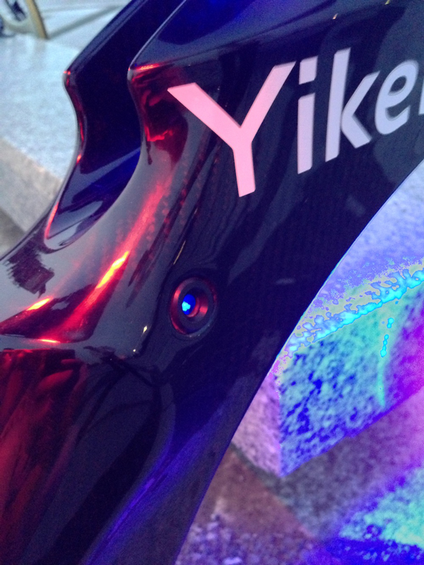 YikeBikeはニュージーランド生まれで、創業者のグラント・ライアンらが5年の歳月をかけて開発した。モデルはボディ素材の違いで、アルミ&コポジット製のフュージョン(14kg)、カーボンファイバー&&コポジット製のシナジー(12.7kg)、そしてカーボンファイバー製のカーボン(10.2kg)の3種類があり、今回試乗したのは、最上位のカーボンにロノフデザインが電飾カスタマイズを施した特別モデルである。