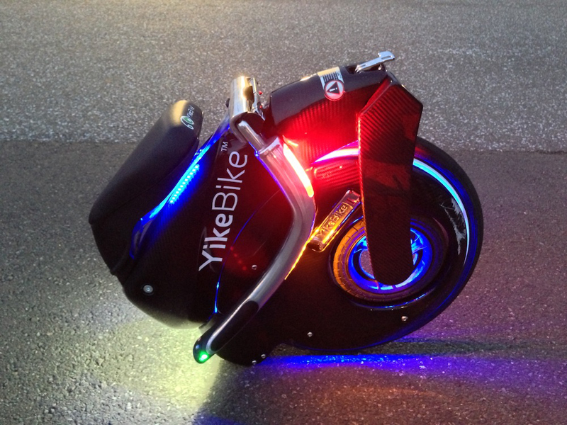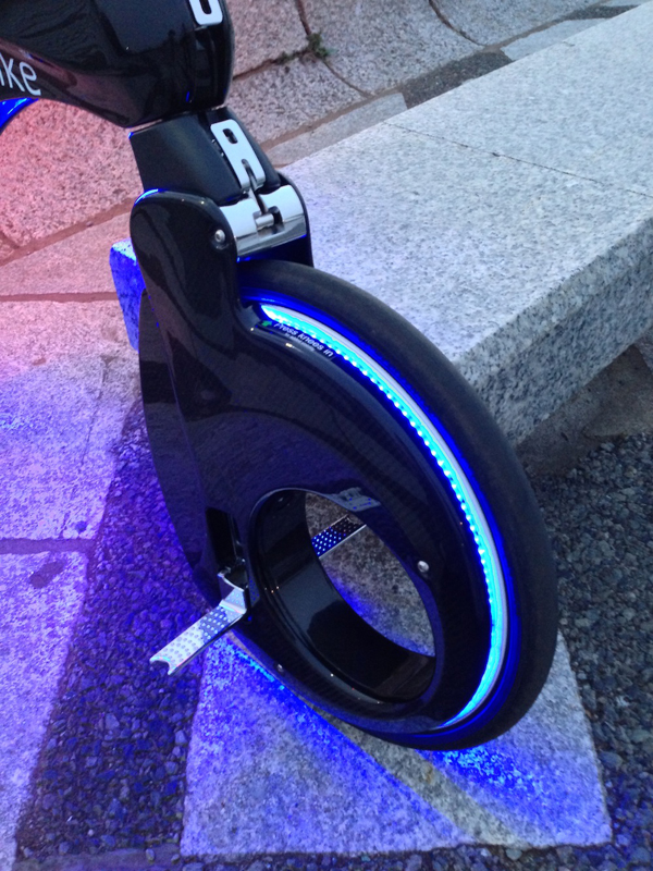 YikeBike単体の姿。前輪の三日月型の部分にモーターやバッテリーなどが収まっている。ちなみに、車輪のリムやシート下のLEDライトが装着されたこのモデルは、最上位でフルカーボン素材のボディを持つYikeBike|Carbonをロノフデザインがカスタマイズしたもの。(クリックで拡大)