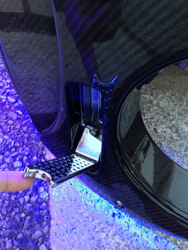 非使用時のステップは前輪の側面に面一の状態でたたまれるほか、リンク機構によって、片方を操作するだけで、もう片側も開閉される仕組みだ。(クリックで拡大)