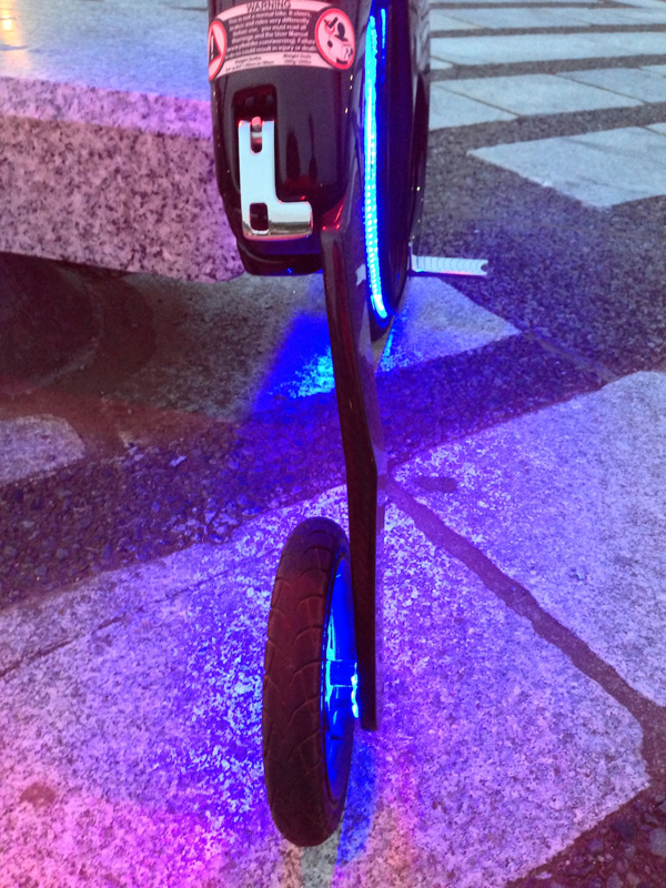 YikeBikeの走行姿勢。シートの後ろから前方向に伸びるハンドルを体の左右で握り、前輪のステップに脚を載せて走る。乗り手は、今回の試乗の手配をしていただいた(株)ロノフデザインの臼木 幸一郎代表。(クリックで拡大)