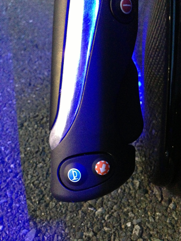 同じく、左右のハンドル先端部には、メイン電源スイッチ(緑)、ホーンボタン(青)、そしてウィンカースイッチ(赤)が設けられている。アクセルとブレーキは、ハンドルのグリップ部分と一体化したレバーを握る強さに応じて機能する。(クリックで拡大)