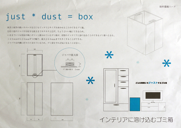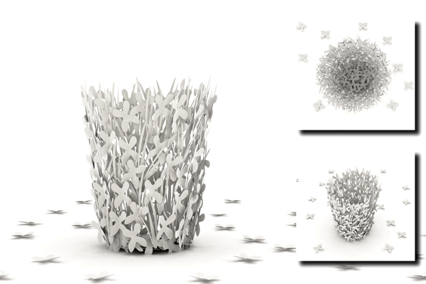 鷲尾和哉/京都市左京区 使用ツール:Rhinoceros、CINEMA 4D ○オブジェのようなゴミ箱「tyotyo」。現状のゴミ箱はできるだけ目の届かない所に置きたくなるようなモノばかりである。そこでオブジェクトのような飾れる美しいゴミ箱を提案。 |