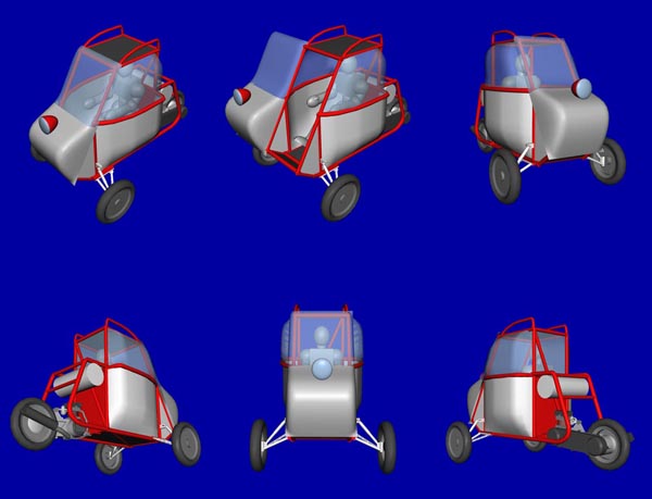 井上和彦/埼玉県草加市 使用ツール:AC3D、Photoshop ○雨にぬれず、環境汚染も最小限でお財布にも優しい。ボディはパイプフレームにエンプラとポリカーボネート。ハンドル、ブレーキ、アクセルは、フライバイワイヤーで、サーボ式Gセンサーを使って、まっすぐ走ったり、転倒防止の制御をする。運転は、ゲーム機のコントローラーのようなものでする。前スライドドア乗降式。 |