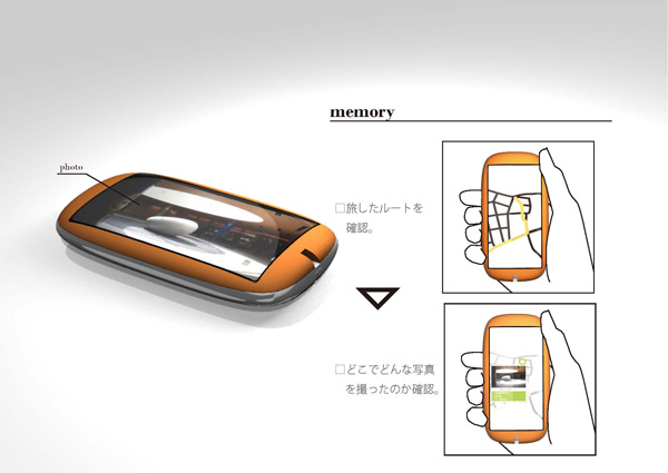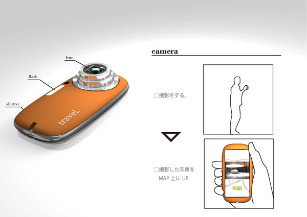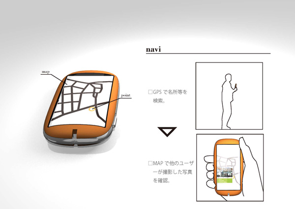 浅野達哉/大阪府大阪市 使用ツール:Shade 9、Illustrator CS3、Photoshop EL5 ○カメラを持って旅行に出かけて「あの場所はどこから撮ったのだろう?」「この近くにはどんな綺麗なものや場所があるのだろう?」。このように思ったとき、どのようにしたら楽しく解決できるかと考え、このプロダクトを提案しました。 travel.はGPSを用いたMAPにユーザーが写真をアップすることで自分の知らないさまざまな名所などを知り、そこに行って写真を撮り、思い出を残せます。また旅をしたルートを記録しMAP上で旅のルートをたどりながら撮影した写真を観覧することができます。撮影はシャッターボタン(左右をずらすことでZOOM、軽く押し込んでフォーカスロック)で行い、MAPの操作や撮影の設定などは背面のタッチパネルディスプレイで行います。 ナビ カメラ メモリ |