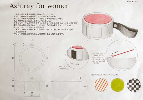 内原利之/東京都青梅市 ○消しゴムの広い面積と狭い面積を使い分けたい。自分の使い方として、四カドのいずれかを広い範囲と狭い範囲とで使い分けているため写真のような形状になる(狭い範囲を消すときは消しているところを見やすいように、立てて消している。広い範囲は寝かせて消しているため、このような形状ですり減っている)。従来の消しゴムだと最初から広い面積を消せる用途としては不足なため、ここでは異断面(角Rの差別)での製品を提案し、1つの消しゴムで2つの使い方(広い、狭い)を提案したい。右利き、左利きで力のかけ方、減り方が異なるため、販売時は黄色のパッケージを真ん中にしておき、利き手に合わせてどちらかにスライドさせて使ってもらう。 |