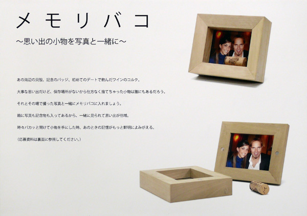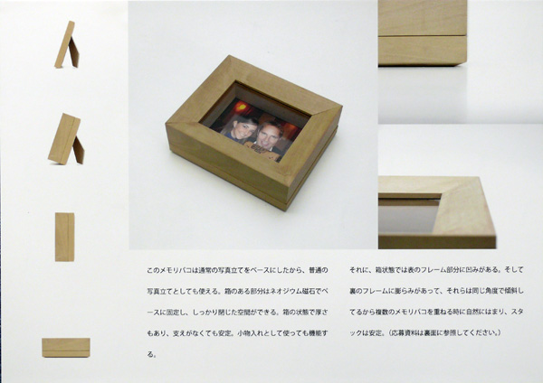 李 威震/兵庫県神戸市 使用ツール:Photoshop CS2、自作パソコン ○あの海辺の貝殻、記念のバッジ、初めてのデートで飲んだワインのコルク。大事な思い出だけど、保存場所がないから仕方なく捨ててしまった小物は誰にもあるだろう。それとその場で取った写真と一緒にメモリバコに入れましょう。箱に写真も記念物も入っているから、一緒に見られて思い出が倍増。時々パカッと開けて小物を手にすれば、あのときの記憶がもっと鮮明によみがえる。 このメモリバコは通常の写真立てをベースにしたから、普通の写真立てとしても使える。箱のある部分はネオジウム磁石でベースに固定し、しっかり閉じた空間ができる。箱の状態で厚さもあり、支えがなくても安定。小物入れとしても使っても機能する。また、箱状態では表のフレーム部分に凹みがある。そして裏のフレームに膨らみがあって、それらは同じ角度で傾斜しているから複数のメモリバコを重ねる時に自然にはまり、スタックは安定する。 使い方 |