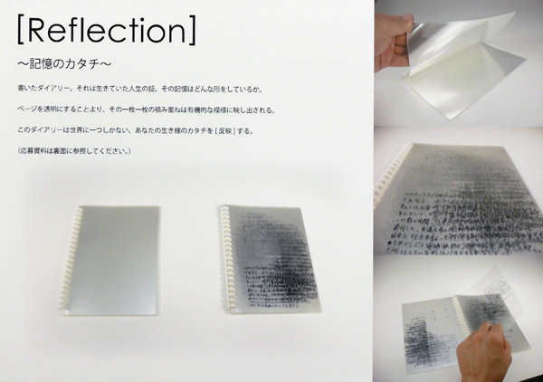 李 威震/兵庫県神戸市 使用ツール:Photoshop CS2、自作パソコン ○ダイアリー。それは生きていた人生の証。その記憶はどんな形をしているか。ページを透明にすることより、その1枚1枚の積み重ねは有機的な模様に映し出される。 このダイアリーは世界に1つしかない、あなたの生き様のカタチを[反映]する。 |