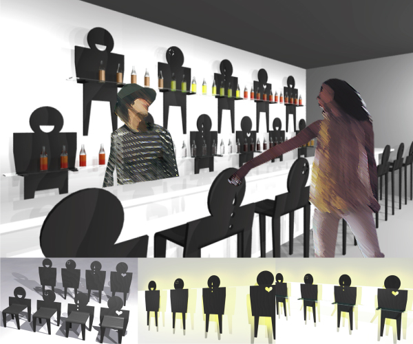 三浦喜世/兵庫県明石市 使用ツール:Shade 5、Illustrator 10、Photoshop 6 ○足や手を曲げると椅子になり、棚受けになり、1枚の板を曲げてツクラレル影が、さまざまにオブジェとして機能します。 影が人につき従う? 人が影にひっぱられるようにかたちづくられる? 隠された人の心が影に反映されたりして…影からつくられる空間に興味があります。 |