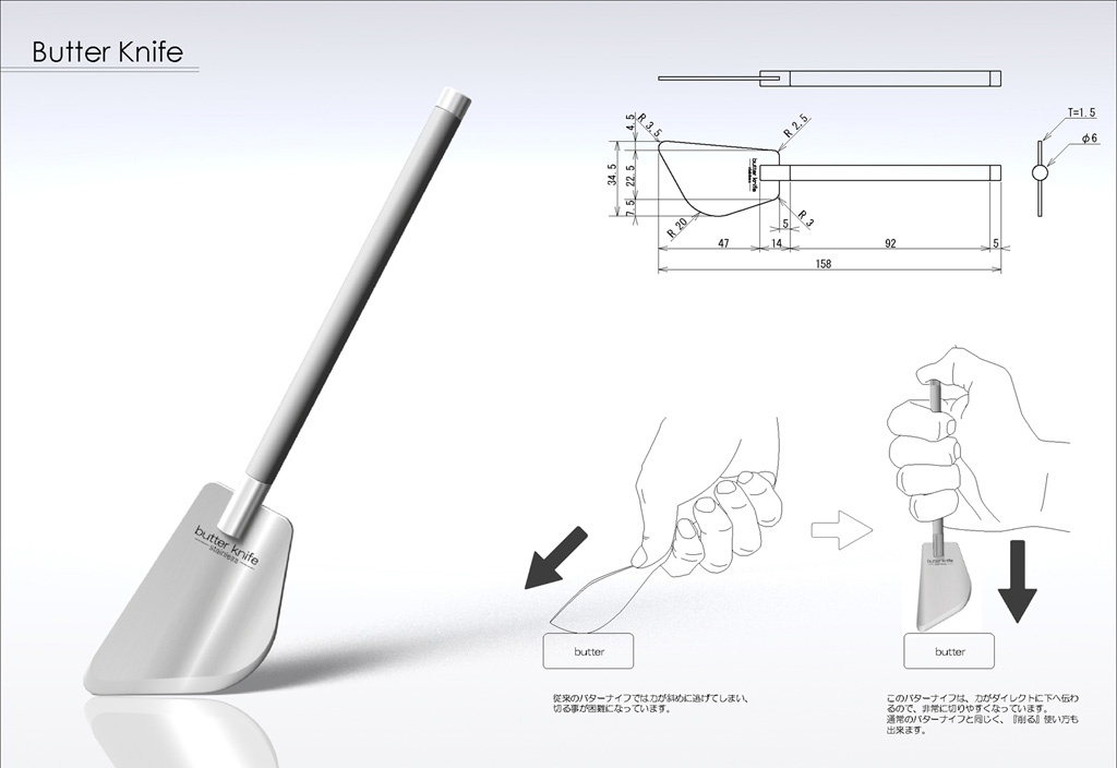 橋本崇秀/兵庫県神戸市 使用ツール:Shade 8 ○『切る』ことも考えたバターナイフです。 料理をしていると大きな塊でバターを使いたい時があります。しかし、従来のバターナイフは『削る』ことを念頭に考えられています。そこで、『切る』ことも気軽にできるバターナイフを考えました。 |
