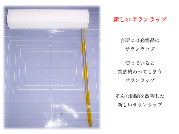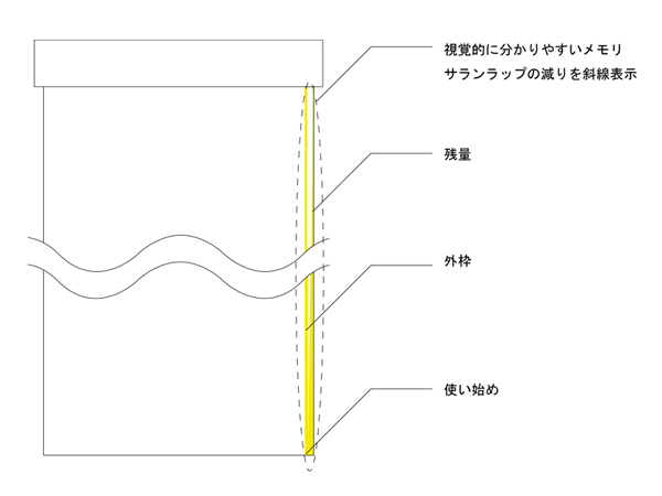 榊原伸一/愛知県豊川市 ○サランラップは台所用品として頻繁に使うモノ。調理中に使用したり、作り置く料理を一時的に密封したりなど、毎日料理をする上で欠かせないモノである。その利便性は高いが、ラップ自体が透明であり、筒に巻かれているため、ラップの残量が非情に分かりにくい。またサランラップの必要性は高いが、個々が認識する重要性はそれほど高くないため、使い切ってしまい困ったこともあるだろう。今回の提案は、そんな小さなミスを防ぐ新しいサランラップ。ラップとしての機能は保持し、使用残量を視覚化させる。これでもう突然終わってしまうサランラップに困ることはない。 解説 |
