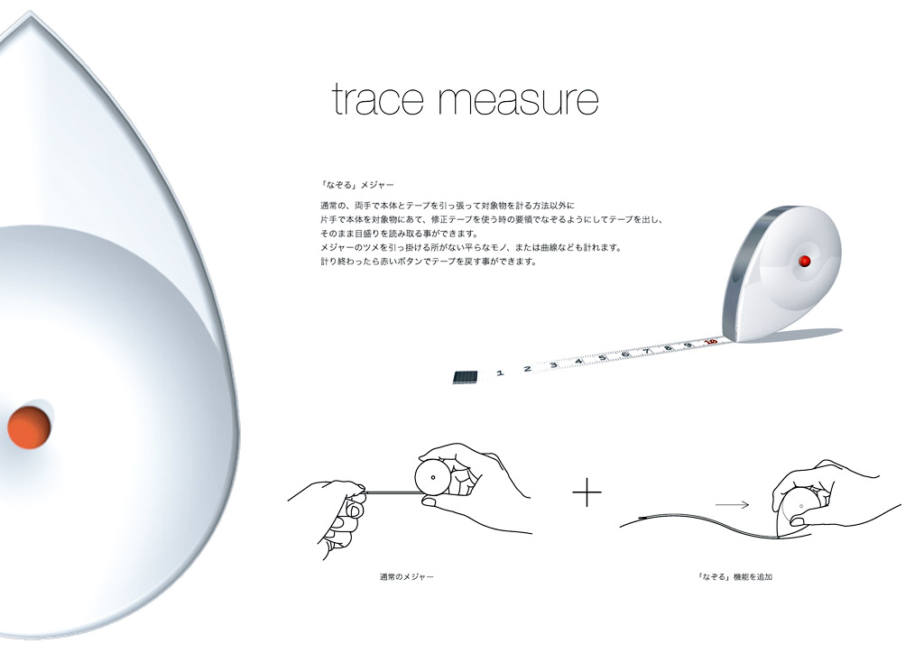 青柳裕之/神奈川県相模原市 ○「なぞる」メジャー。通常の、両手で本体とテープを引っ張って対象物を計る方法以外に、片手で本体を対象物に当て修正テープを使う時の要領でなぞるようにしてテープを出し、そのまま目盛りを読み取ることができます。 メジャーのツメを引っ掛けるところがない平らなモノ、または曲線なども計れます。計り終わったら赤いボタンでテープを戻すことができます。 |