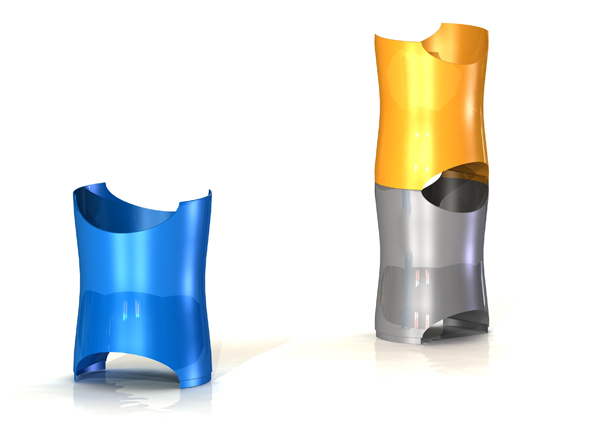 岡本雄一朗/京都府京都市 使用ツール:SolidWorks 2007 ○積み重ねて使えるごみ箱です。重ねても下のごみ箱が使え、重なることにより上下が合致しごみ箱の捨て口になるようにデザインしました。自分が必要な分だけ積み重ねて使え、なおかつ重ねるので場所を取りません。 全体 |
