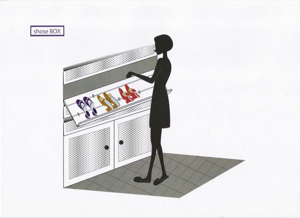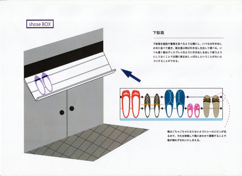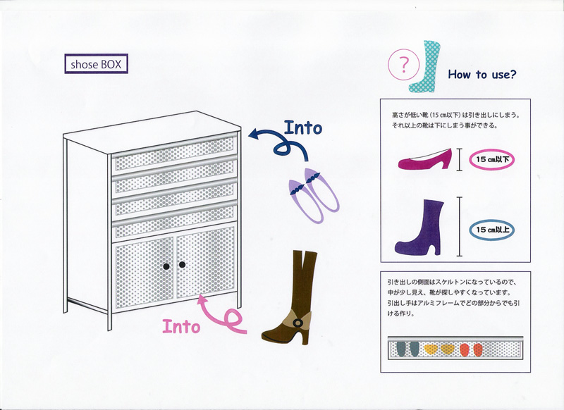 大槻恵莉子/長野県上伊那郡 使用ツール:Illustrator ○下駄箱にしまうとどんな靴かがひと目見て分からないことがあり、いつも靴が玄関に散らばってしまっている状態になってしまいます。それをどうにかして下駄箱にしまって見やすく、取り出しやすく、収納がいいものが欲しいと思い、本などをディスプレイする棚が下駄箱だったらいいと制作しました。 使い方 並べ方 |