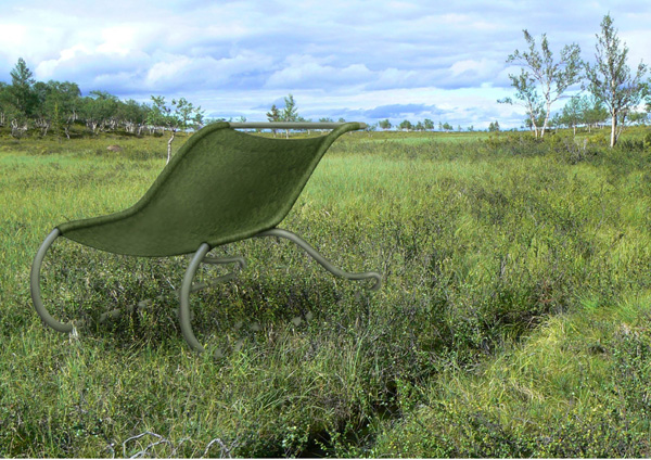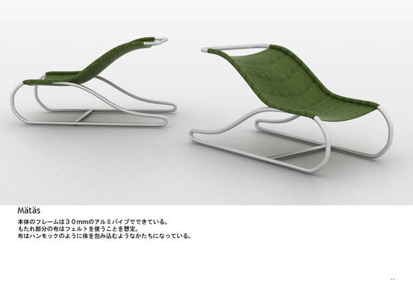 Arttu-Matti lemmonen(アルットゥマッティ・イッモネン)/フィンランド 使用ツール:Rhinoceros 4.0、Photoshop CS3、InDesign CS3 ○本体のフレームは30ミリのアルミパイプでできている。もたれ部分の布はフェルトを使うことを想定。布はハンモックのように体を包み込むようなかたちになっている。 外が似合う |