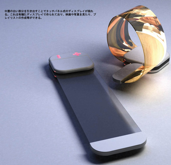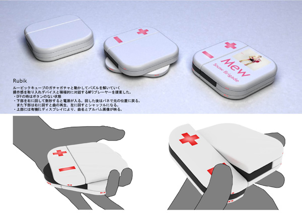Arttu-Matti lemmonen(アルットゥマッティ・イッモネン)/フィンランド 使用ツール:Rhinoceros 4.0、Photoshop CS3、InDesign CS3 ○ルービックキューブのガチャガチャと動かしてパズルを解いていく操作感を取り入れ、デバイスと積極的に対話するMP3プレーヤーを提案した。 ・OFFの時はボタンのない状態。 ・カブを右に回して数秒すると電源が入る。回した後はバネで元の位置に戻る。また、下部は右に回すと極の再生、左に回すとシャッフルになる。 ・上部には有機ELディスプレイにより、曲名とアルバム画像が映る。 タッチパネル式のディスプレイが出てくる |