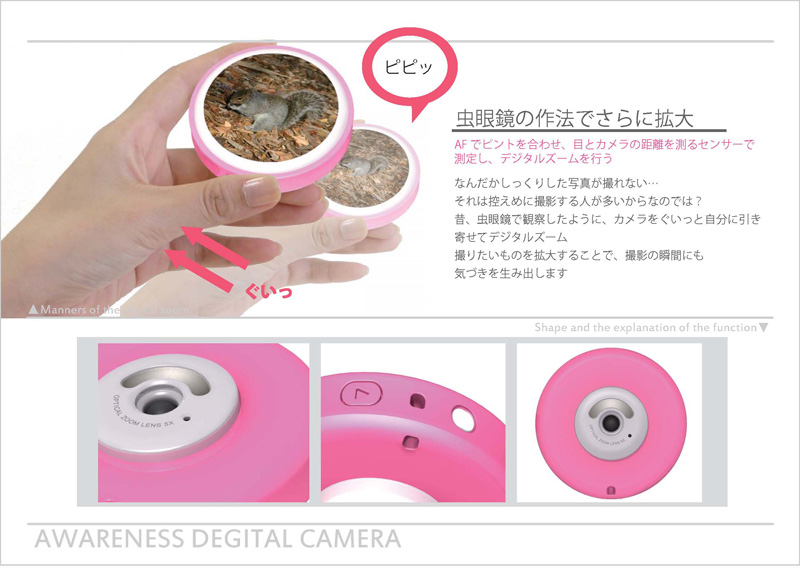 酒井裕理/大阪府大阪市 使用ツール:SolidWorks、Illustrator CS3、Photoshop CS3 ○私たちの身近な存在となったデジタルカメラ。高機能・高画質なカメラを使えば本当の意味で価値ある写真が撮れるだろうか? 虫眼鏡をメタファーに、意識が集中する『丸』いカタチに着目し、デジタルならではの『気づき』を得られるカメラを提案。 虫メガネ的にも |