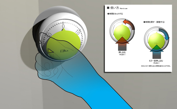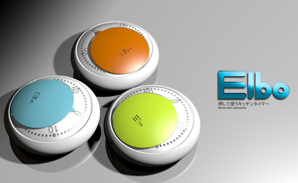 土肥秀俊/愛知県碧南市 使用ツール:Rhinoceros4.0、Flamingo 1.1 ○「Elbo」は『押して使うキッチンタイマー』。調理は手を使う作業。調理中の指先は水に濡れていたり、食材を直接触るため臭いがついたりしている。そのため今までの指先を使ってひねったり、ボタンを押したりするキッチンタイマーを使うには、一度手を洗うために調理を中断する必要があった。そこで、調理を中断せず、手が汚れていたりしても手の平、手の甲、腕、肘を使ってタイマーをセットできる『押して使う』ことのできるキッチンタイマーを提案する。 使い方 |