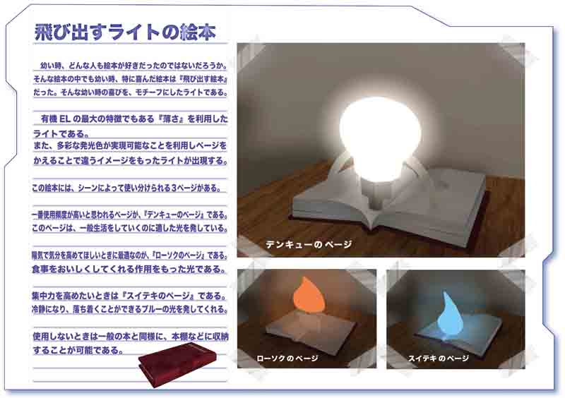 谷 幸祐/兵庫県神戸市 使用ツール:CINEMA 4D、Photoshop、Illustrator ○幼いとき、どんな人も絵本が好きだったのではないだろうか。その中でも幼いとき、特に喜んだ絵本は『飛び出す絵本』だった。そんな幼いときの喜びを、モチーフにしたライトである。 |