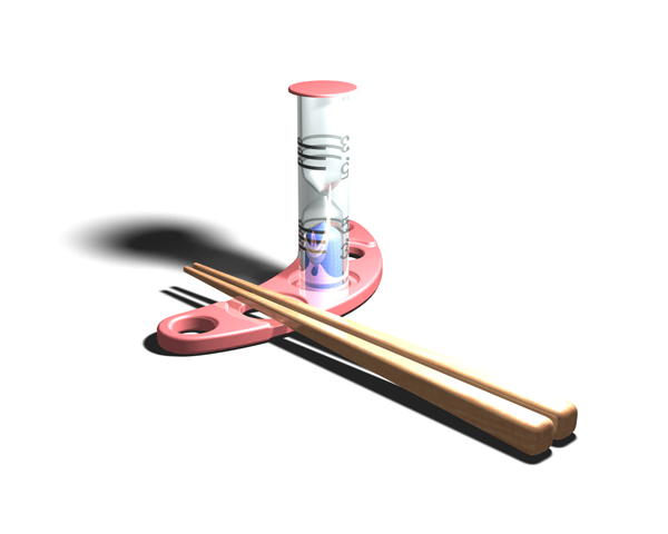 佐々木彰男/神奈川県藤沢市 使用ツール:AliasStudio ホームページ:http://www.digicrafter.co.jp ○カップ麺に湯を注いだ時に、フタを押さえながら、茹で上がりの時間を計るスタイリッシュな砂時計。普通の砂時計と同じように、天地を逆にしてカップ麺のフタに載せると、三日月形の板が砂時計の外筒をスライドして重しとなり、フタがめくれるのを防ぐ。 目安として3、4、5分の目盛をつけてある。フタ押さえの部分は各サイズのカップ麺に使用可能、また箸置きとしても利用できる。 箸置きに |