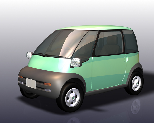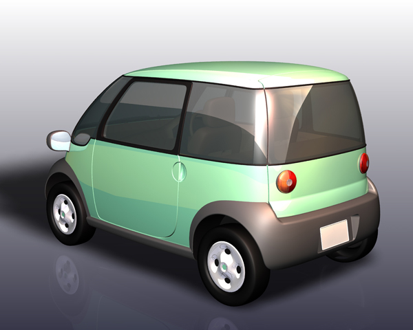 佐々木彰男/神奈川県藤沢市 使用ツール:AliasStudio ホームページ:http://www.digicrafter.co.jp ○2人乗りで、軽自動車を短くしたサイズのシティカー。シンプルなボディに対して、前後のグレイのバンパー部分と、LED ヘッドランプを組み込んだサイドミラーがスタイルの特徴になっている。 全長2,600×全幅1,475×全高1,500ミリ、ホイールベース1,800ミリ、タイヤ165/60-13、660ccエンジンまたは電気モーター駆動。 リア |