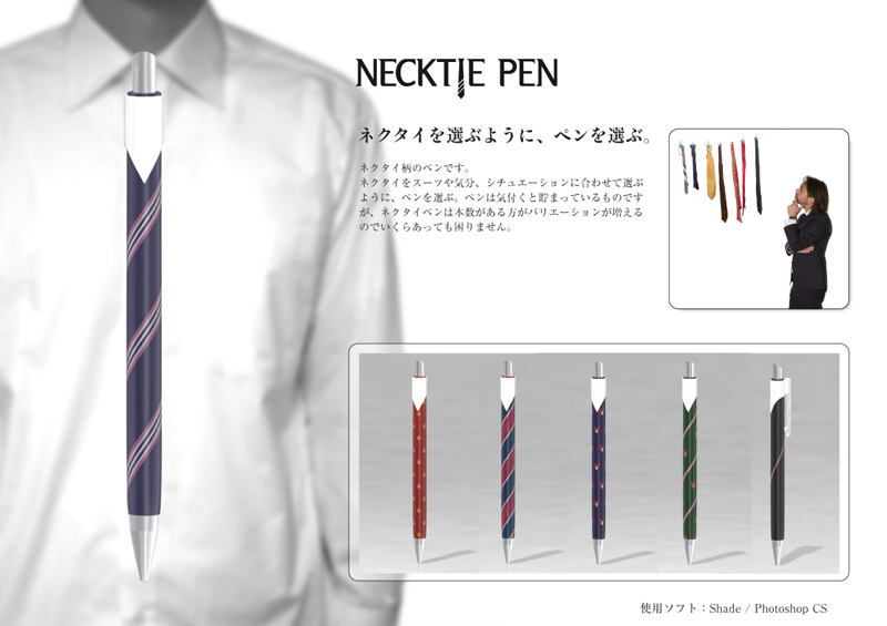 宮崎 了/東京都江東区 使用ツール:Shade、Photoshop CS ○ネクタイ柄のペンです。ネクタイをスーツや気分、シチュエーションに合わせて選ぶように、ペンを選ぶ。ペンは気づくとたまっているものですが、ネクタイは本数があるほうがバリエーションが増えるのでいくらあっても困りません。 |