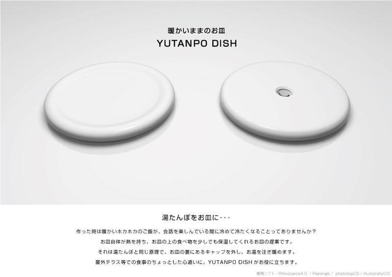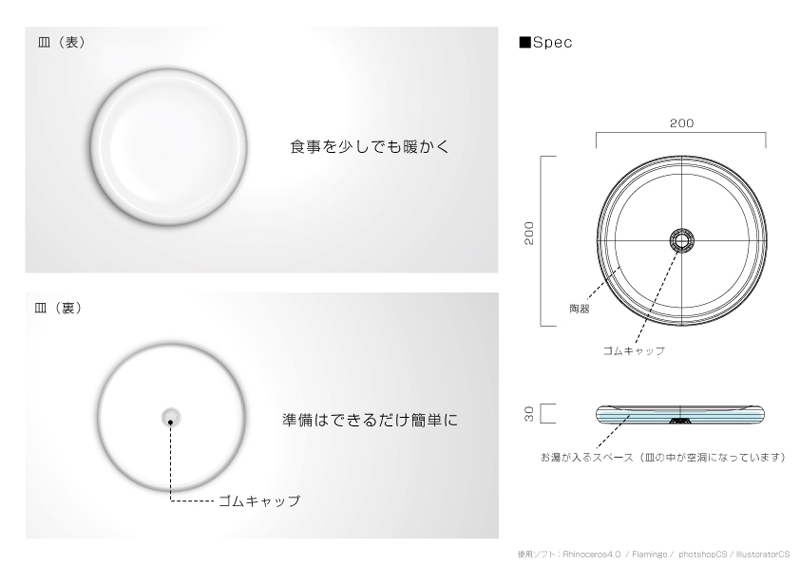 小林達也/東京都品川区 使用ツール:Rhinoceros 4.0、Flamingo、Illustorator CS、Photshop CS/ハード:Windows Core 2 Duo Desktop ホームページ:http://thouse777.web.fc2.com/ ○作ったときは温かいホカホカのご飯が、会話を楽しんでいる間に冷めて冷たくなることってありませんか? お皿自体が熱を持ち、お皿の上の食べ物を少しでも保温してくれるお皿の提案です。それは湯たんぽと同じ原理で、お皿の裏にあるキャップを外し、お湯を注ぎ温めます。 |