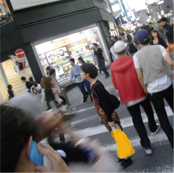 深見浩美/東京都世田谷区 使用ツール:− ○耳からポケットの中へとつながる音楽プレーヤーのコード。 |