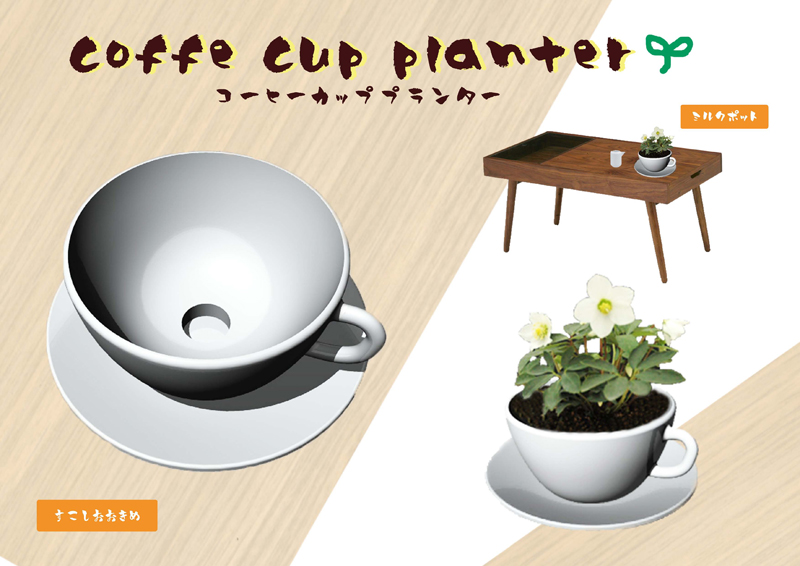 小池弓月/京都府京都市 使用ツール:Rhinoceros 4.0、Illustrator CS3、Photoshop CS3 ○カフェの空間にあるようなカップと植物を融合させたプランター。 |