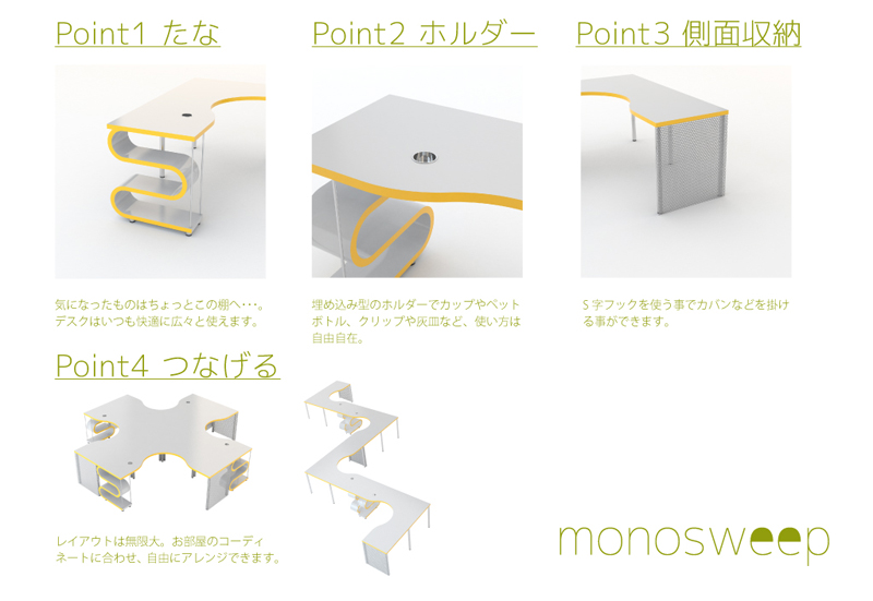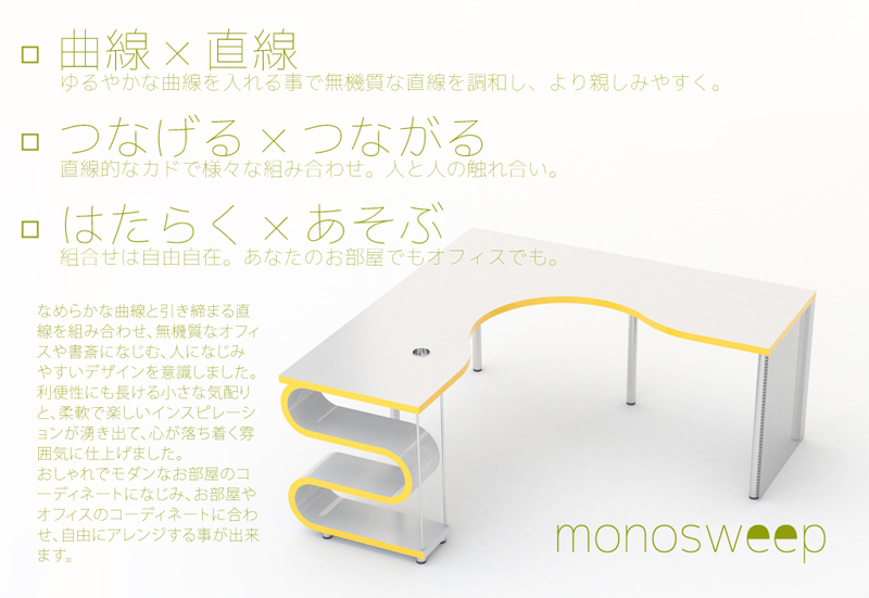 礒端なつみ/福岡県中央区 使用ツール:Illustrator CS、Shade 7 professional/ハード:Mac OS 10.4 ○床をはっているだけの延長コードですが、この「くれぱすコード」は部屋にちょっとした楽しみを与えてくれます。コードの部分が自由自在に曲げられ、さまざまな形を表現できるようにしました。 |