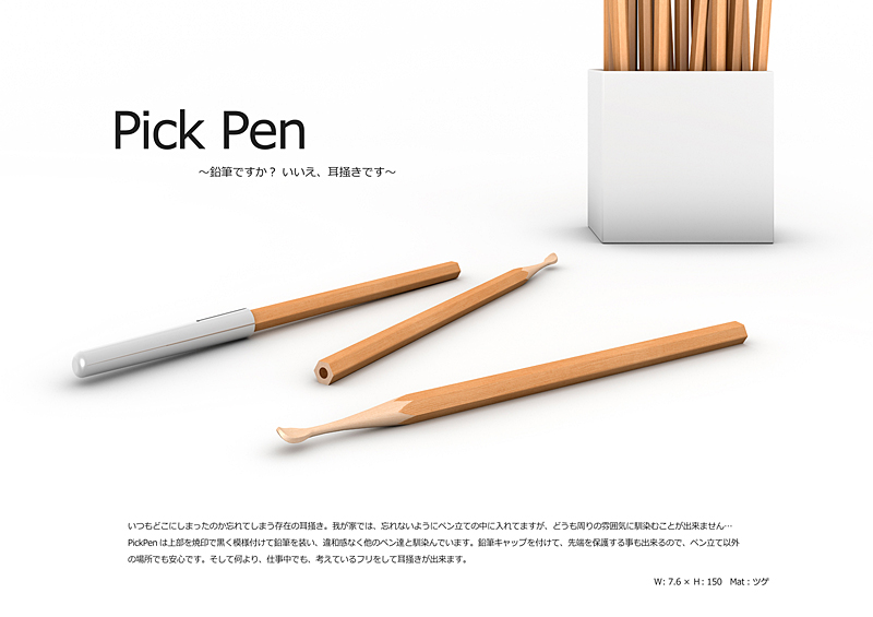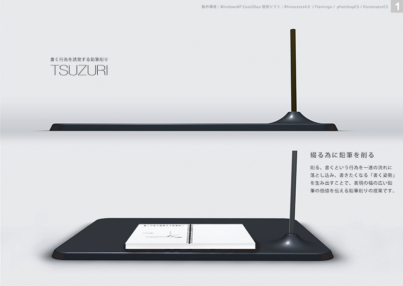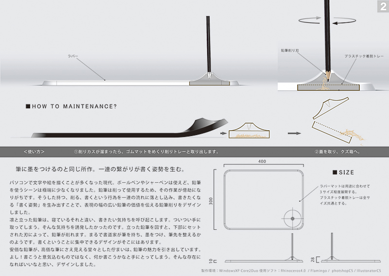小林達也/東京都品川区 使用ツール:Rhinoceros 4.0、Flamingo、Photoshop CS、Illustrator CS/ハード:Windows XP Core 2 Duo ○パソコンで文字や絵を描くことが多くなった現代。ボールペンやシャーペンは使えど、鉛筆を使うシーンは極端に少なくなりました。鉛筆は削って使用するため、その作業が億劫になりがちです。そうした持つ、削る、書くという行為を一連の流れに落とし込み、書きたくなる「書く姿勢」を生み出すことで、表現の幅の広い鉛筆の価値を伝える鉛筆削りをデザインしました。 |