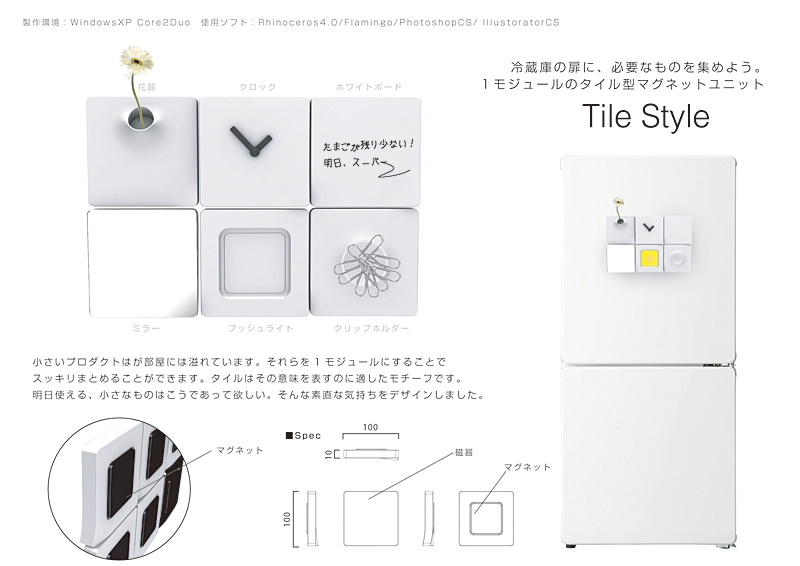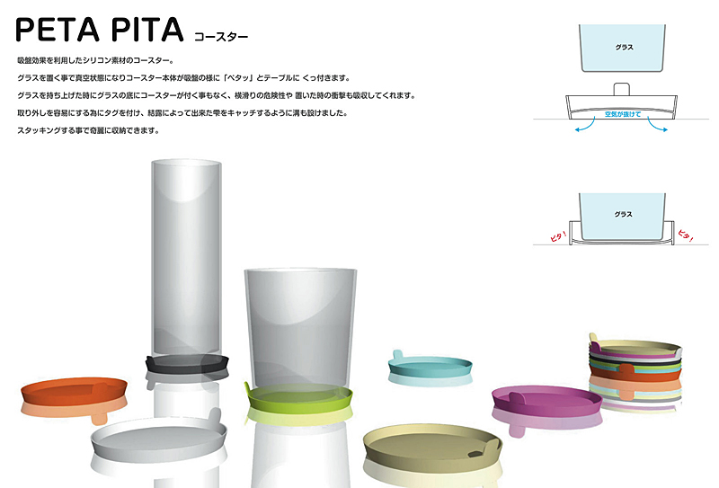 梅野 聡/東京都大田区 URL:http://www.umenodesign.com 使用ツール:− ○吸盤効果を利用したシリコン素材のコースター。グラスを置くことで真空状態になりコースター本体が吸盤のように「ペタッ」とテーブルにくっ付きます。グラスを持ち上げたときにグラスの底にコースターが付くこともなく、横滑りの危険性や置いたときの衝撃も吸収してくれます。取り外しを容易にするためにタグをつけ、結露によってできた雫をキャッチするように溝も設けました。スタッキングすることできれいに収納できます。 |