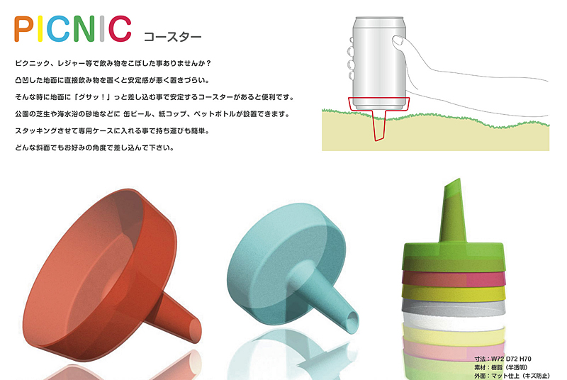 梅野 聡/東京都大田区 URL:http://www.umenodesign.com 使用ツール:− ○ピクニック、レジャーなどで飲み物をこぼしたことありませんか? 凸凹した地面は安定感が悪く、飲み物を直接置きづらい。そんなときに地面に「グサッ!」と差し込むことで安定するコースターがあると便利です。公園の芝生や海水浴の砂地などに缶ビール、紙コップ、ペットボトルが設置できます。スタッキングさせて専用ケースに入れることで持ち運びも簡単。どんな斜面でもお好みの角度で差し込んでください。 |