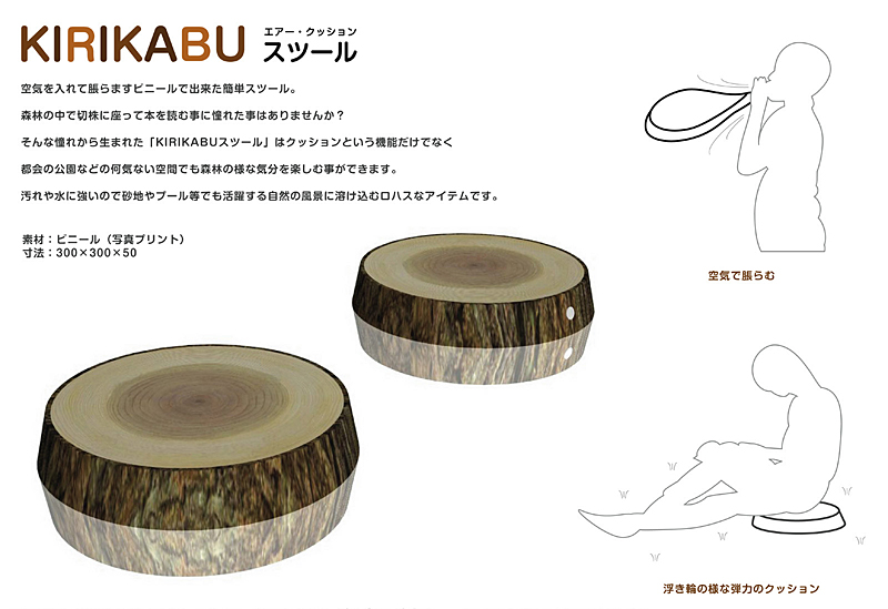 梅野 聡/東京都大田区 URL:http://www.umenodesign.com 使用ツール:− ○空気を入れて膨らますビニールでできた簡単スツール。森林の中で切り株に座って本を読むことに憧れたことはありませんか? そんな憧れから生まれた「KIRIKABUスツール」はクッションという機能だけでなく、都会の公園などの何気ない空間でも森林のような気分を楽しむことができます。汚れや水に強いので砂地やプール等でも活躍する、自然の風景に溶け込むロハスなアイテムです。 |