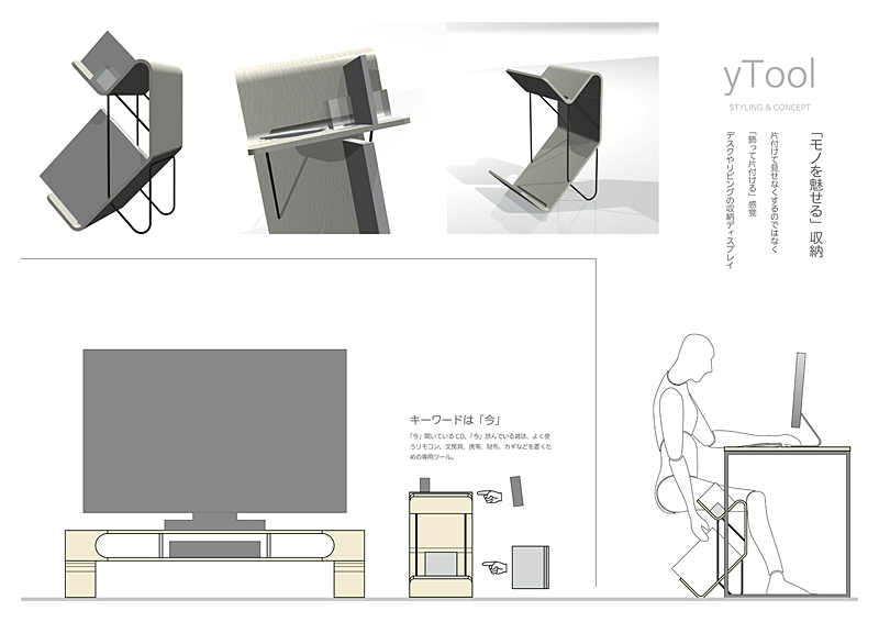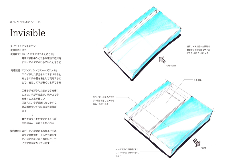 庄崎隆之/大阪府吹田市 使用ツール:スケッチ ○立ったままメモを取るときに、書き手の支えとなるスペースを作ることができれば、スムーズにメモを取ることができ、便利になると考え制作しました。 |