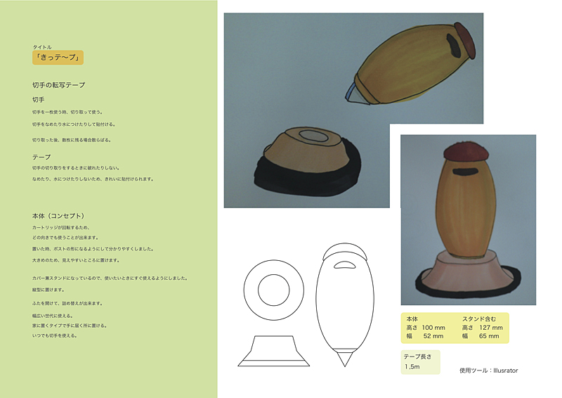 井上智広/奈良県奈良市 使用ツール:Illustrator ○切手を買って使うときに、切らずになめたり水をつけることなく簡単に貼れるようにしました。方向を問わず貼る、使いたいときすぐ貼れるように考えました。机や分かるところに置くようにし、切手をいつでも使えるように考えました。 |
