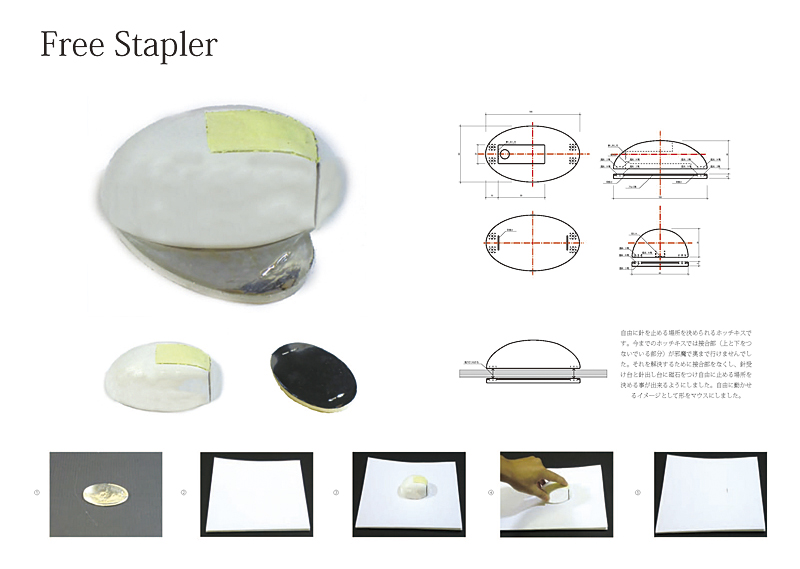 長田尚之/京都府京都市 使用ツール:lllustrator ○今までのホッチキスでは接合部(上と下をつないでいる部分)が邪魔で奥までいけなく、留められる範囲が決まっていました。自由に留める場所を決めることができれば便利になると思い考えました。 |