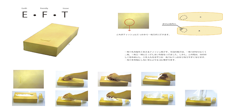 長田尚之/京都府京都市 使用ツール:lllustrator ○今までのティッシュ箱は1枚目が取りにくく無理に取ろうとすると何枚か一緒に取ってしまい、もったいなく思いました。そこで1枚目がしっかり取れ、それによりエコにつながるティッシュ箱を考えました。 |