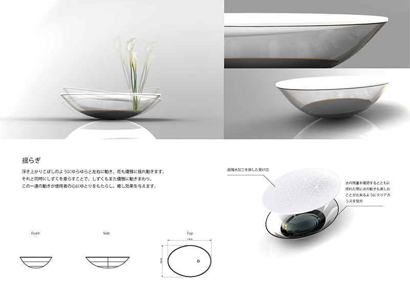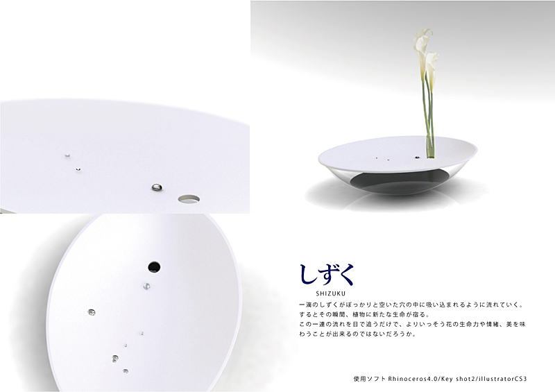 梅花真一郎/大阪府富田林市 使用ツール:Rhinoceros 4.0、KeyShot 2、Illustrator CS3 ○一滴のしずくがぽっかりと空いた穴の中に吸い込まれるように流れていく。するとその瞬間、植物に新たな生命が宿る。この一連の流れを目で追うだけで、よりいっそう花の生命力や情緒、美を味わうことができるのではないだろうか。 |