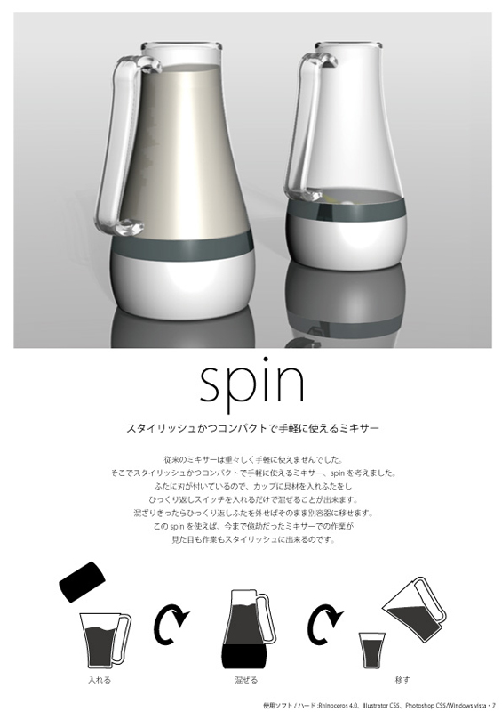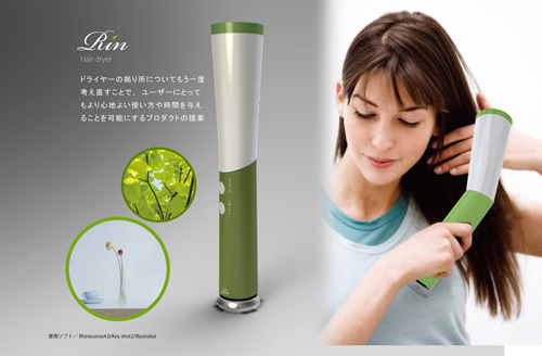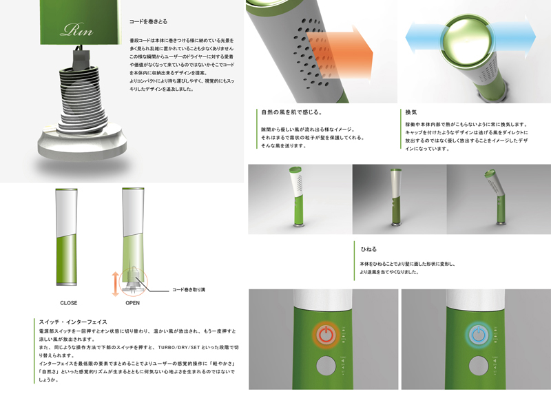 梅花真一郎/大阪府富田林市 使用ツール:Rhinoceros 4.0、KeyShot 2、Illustrator CS3 ○ドライヤーの拠り所についてもう一度考え直すことで、ユーザーにとってもより心地よい使い方や時間を与えることを可能にするプロダクトの提案。 |