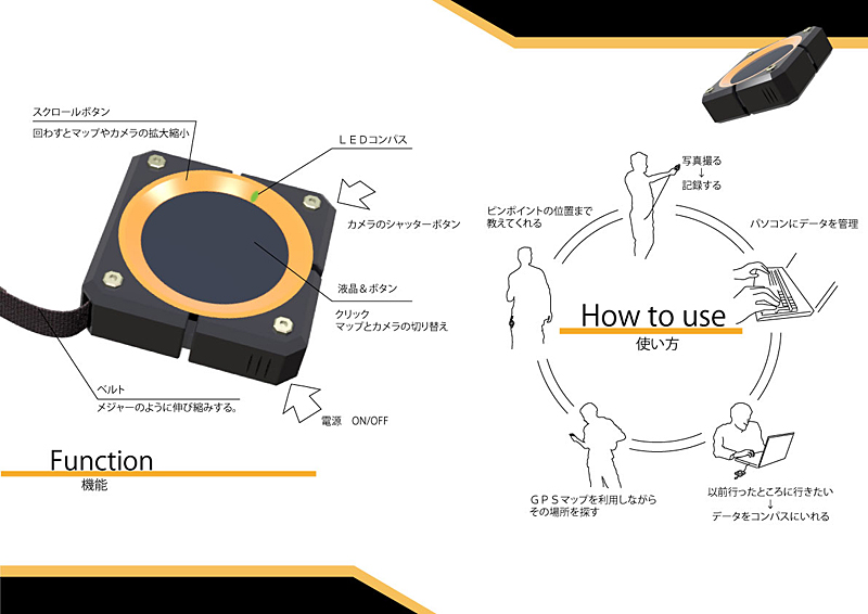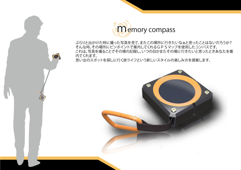 中山裕嗣/大阪府堺市 使用ツール:Rhinoceros、Illustrator、Photoshop ○ぶらりと出かけたときに撮った写真を見て、またこの場所に行きたいなぁと思ったことはないだろうか? そんなとき、その場所にピンポイントで案内してくれるGPSマップを使用したコンパスです。これは、写真を撮ることでその場を記録し、いつの日かまたその場に連れて行ってくれる。 |