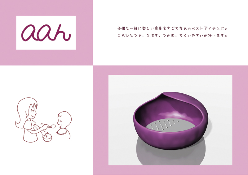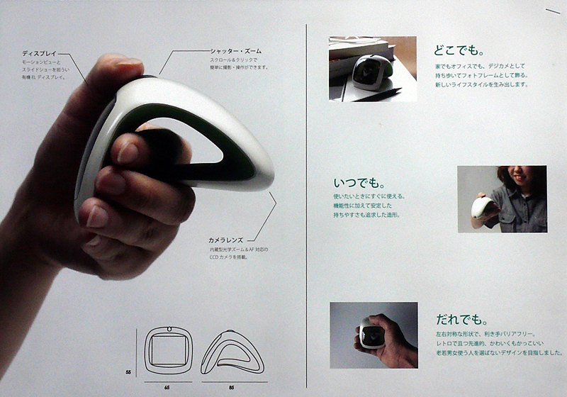 石津雄登/石川県金沢市 使用ツール:モックアップ、Illustrator CS4、Photoshop CS4/ハード:Windows7 core i7 ○近年は若い女性層を中心に、ブログ用にデジタルカメラを常に職場や買い物に持ち歩いて使うユーザーが増えています。一方それらの写真を飾るためのデジタルフォトフレームも人気です。そんなニーズに合わせ、パートナーとして家でも職場でもonのときもoffのときも利用できる、デジカメとフォトフレームを両立したハードウェアを新しい造形によって実現しました。デジタルだからこそできる新しいフォトグラフィーのカタチです。 |