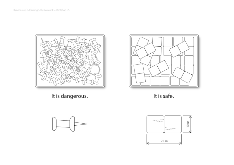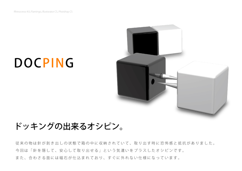 山本雄亮/大阪府東住吉区 使用ツール:Rhinoceros 4.0、Flamingo、Illustrator CS、Photoshop CS ○『ドッキングの出来るオシピン。』従来のものは針がむき出しの状態で箱の中に収納されていて、取り出すときに恐怖感と抵抗がありました。今回は「針を隠して、安心して取り出せる」という気遣いをプラスしたオシピンです。また、合わさる面には磁石が仕込まれており、すぐに外れない仕様になっています。 |