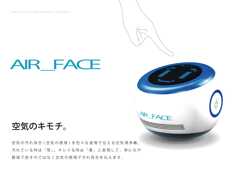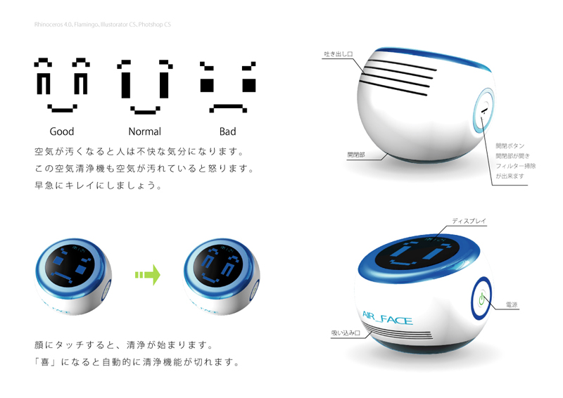 山本雄亮/大阪府東住吉区 使用ツール:Rhinoceros 4.0、Flamingo、Illustrator CS、Photoshop CS ○『空気のキモチ。』空気の汚れ具合(空気の感情)をいろいろな表情で伝える空気清浄機。汚れているときは「怒」、キレイなときは「喜」と表現して、単に光や数値で表わすのではなく空気の感情で汚れ具合を伝えます。 説明図 |
