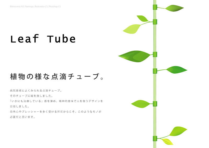 山本雄亮/大阪府東住吉区 使用ツール:Rhinoceros 4.0、Flamingo、Illustrator CS、Photoshop CS ○『植物の様な点滴チューブ。』病院患者によく見られる点滴チューブ。そのチューブに緑を施しました。「いかにも治療している」感を薄め、精神的意味で人を救うデザインを目指しました。恐怖心やプレッシャーを多く受ける所だからこそ、このようなモノが必要だと思います。 |