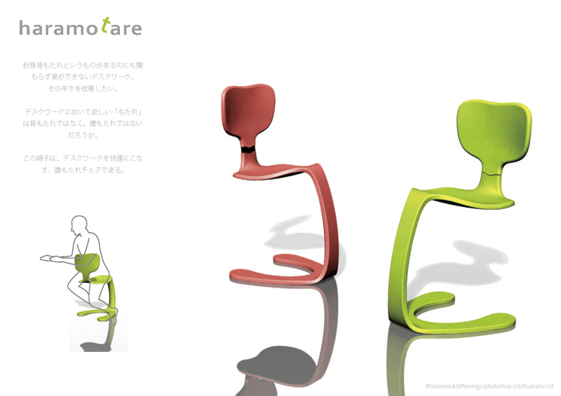 奥田さゆり/大阪府大阪市 使用ツール:Rhinoceros 4.0、Flamingo、Photoshop CS5、Illustrator CS5 ○折角背もたれというものがあるのにもかかわらず楽ができないデスクワーク。その辛さを改善したい。デスクワークにおいて欲しい「もたれ」は背もたれではなく、腹もたれではないだろうか。この椅子は、デスクワークを快適にこなす、腹もたれチェアである。 |