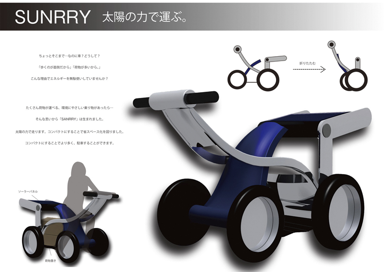竹本志乃/大阪市東住吉区 使用ツール:Rhinoceros4.0、Illustrator CS5、Photoshop CS5 ○ちょっとそこまで…なのに車? どうして? 「歩くのが面倒だから」「荷物が多いから」こんな理由でエネルギーを無駄使いしていませんか? たくさん荷物が運べる、環境にやさしい乗り物があったら…そんな思いから太陽の力で走る「SANRRY」は生まれました。 |