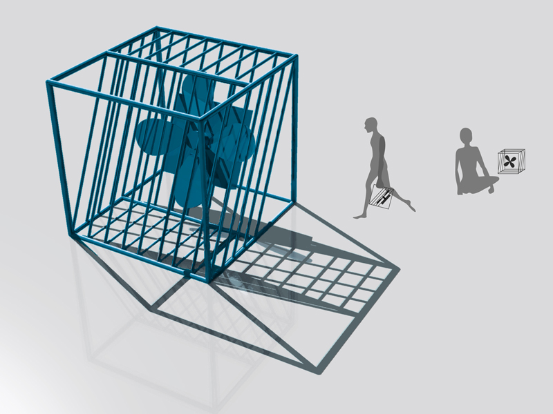 千國芹莉/大阪市阿倍野区 使用ツール:Rhinoceros4.0、PhotoshopCS5、IllustratorCS5 ○従来の扇風機は重く、移動させにくい。そこで家中どこにでも持ち歩ける扇風機を提案する。形はどんな部屋にも置きやすい小型の立方体。立方体の中に傾いた状態で羽があるので、置き方によって羽の向きが変わり首振りが不要になった。 |