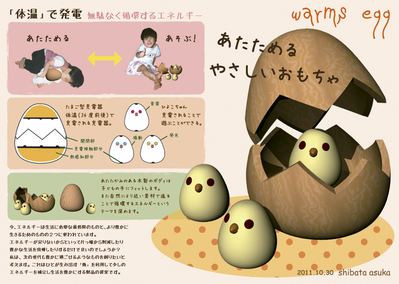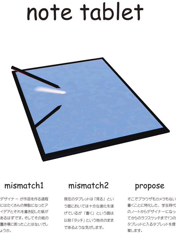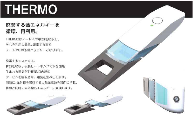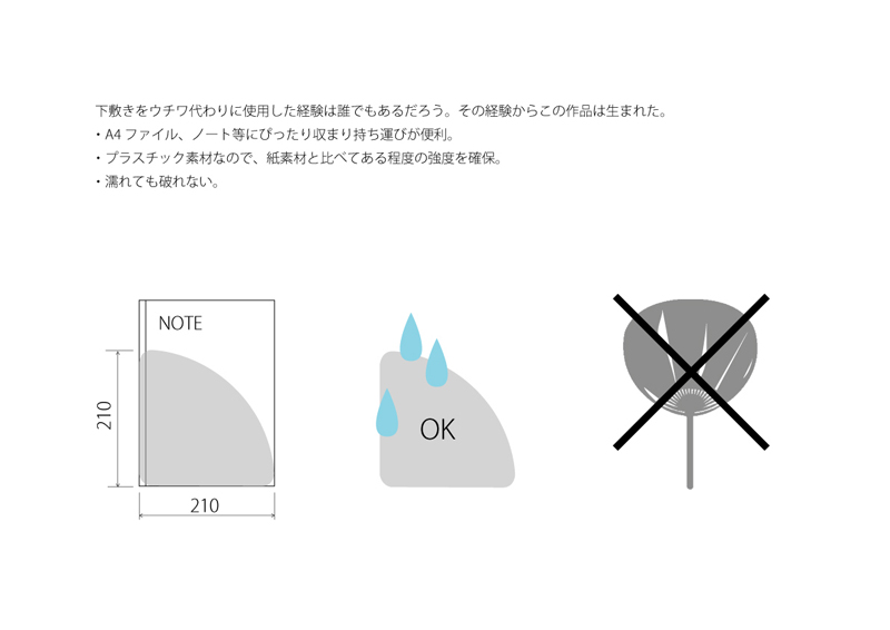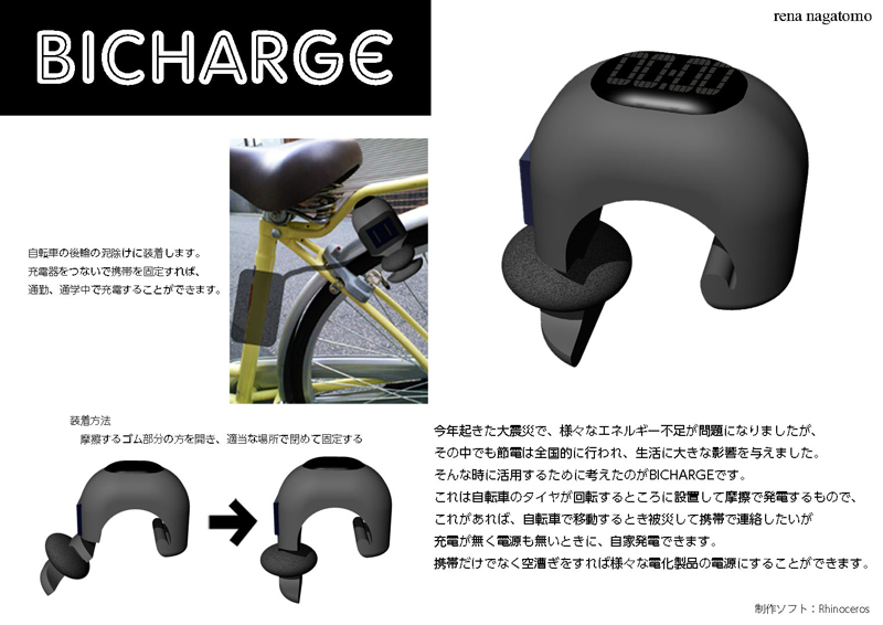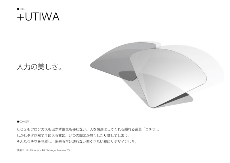 山本雄亮/大阪市東住吉区 使用ツール:Rhinoceros 4.0、Flamingo、IllustratorCS ○CO2もフロンガスも出さず電気も使わない。人を快適にしてくれる頼れる道具「ウチワ」。しかしタダ同然で手に入るゆえに、いつの間にかなくしたり壊してしまう。そんなウチワを見直し、できるだけ壊れないなくさないようにリデザインした。 |