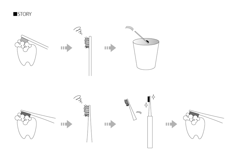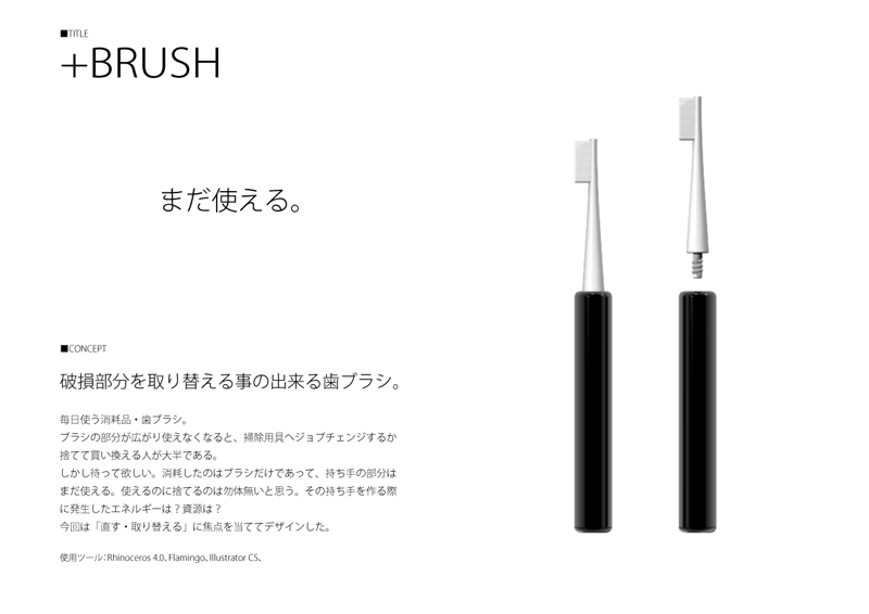 山本雄亮/大阪市東住吉区 使用ツール:使用ツール:Rhinoceros 4.0、Flamingo、IllustratorCS ○破損部分を取り替えることのできる歯ブラシ。毎日使う消耗品、歯ブラシ。ブラシの部分が広がり使えなくなると、掃除用具へジョブチェンジするか、捨てて買い換える人が大半である。しかし待って欲しい。消耗したのはブラシだけであって、持ち手の部分はまだ使える。使えるのに捨てるのはもったいないと思う。その持ち手を作る際に発生したエネルギーは? 資源は? 今回は「直す、取り替える」に焦点を当ててデザインした。 |