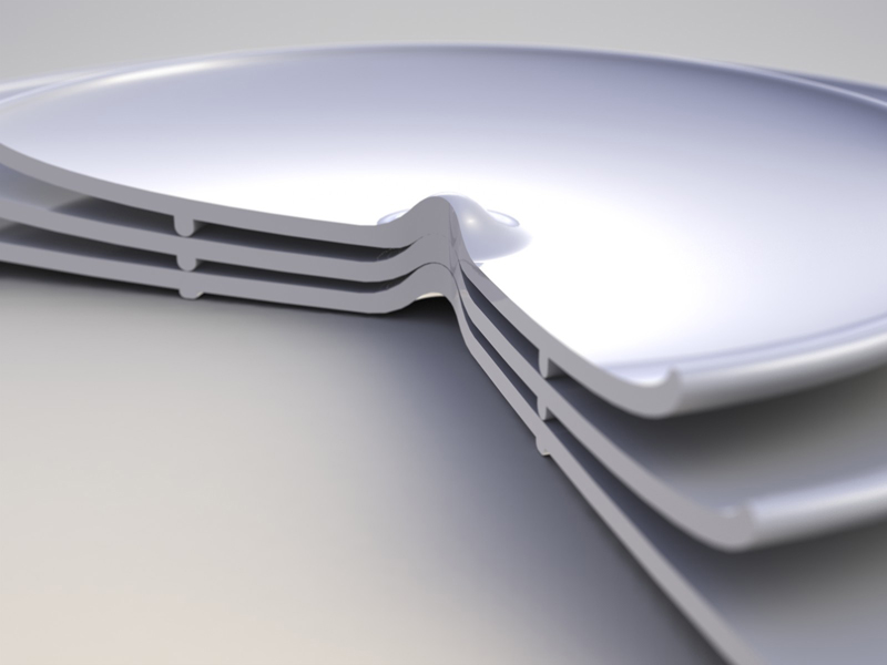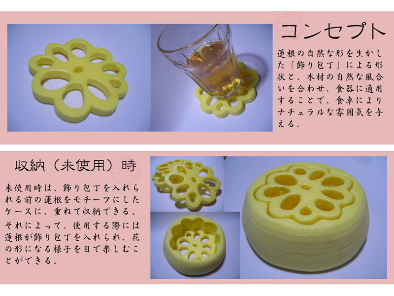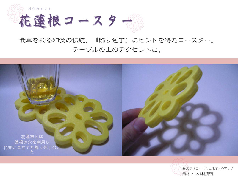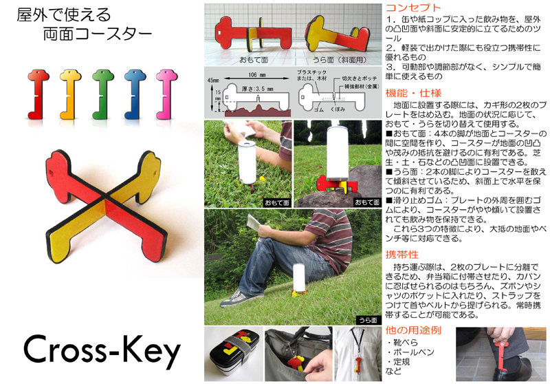 片山茂樹/神奈川県横浜市 使用素材:シリコンゴム型による樹脂成型 ○屋外で飲食をする際、不安定な場所にも缶や紙コップの飲み物を置けるコースターを提案する。分離可能な2枚のプレートで構成されるため、携帯性・収納性に優れる。また、薄いプレート形状は他の用途(靴べら、定規など)に応用しやすい。 |